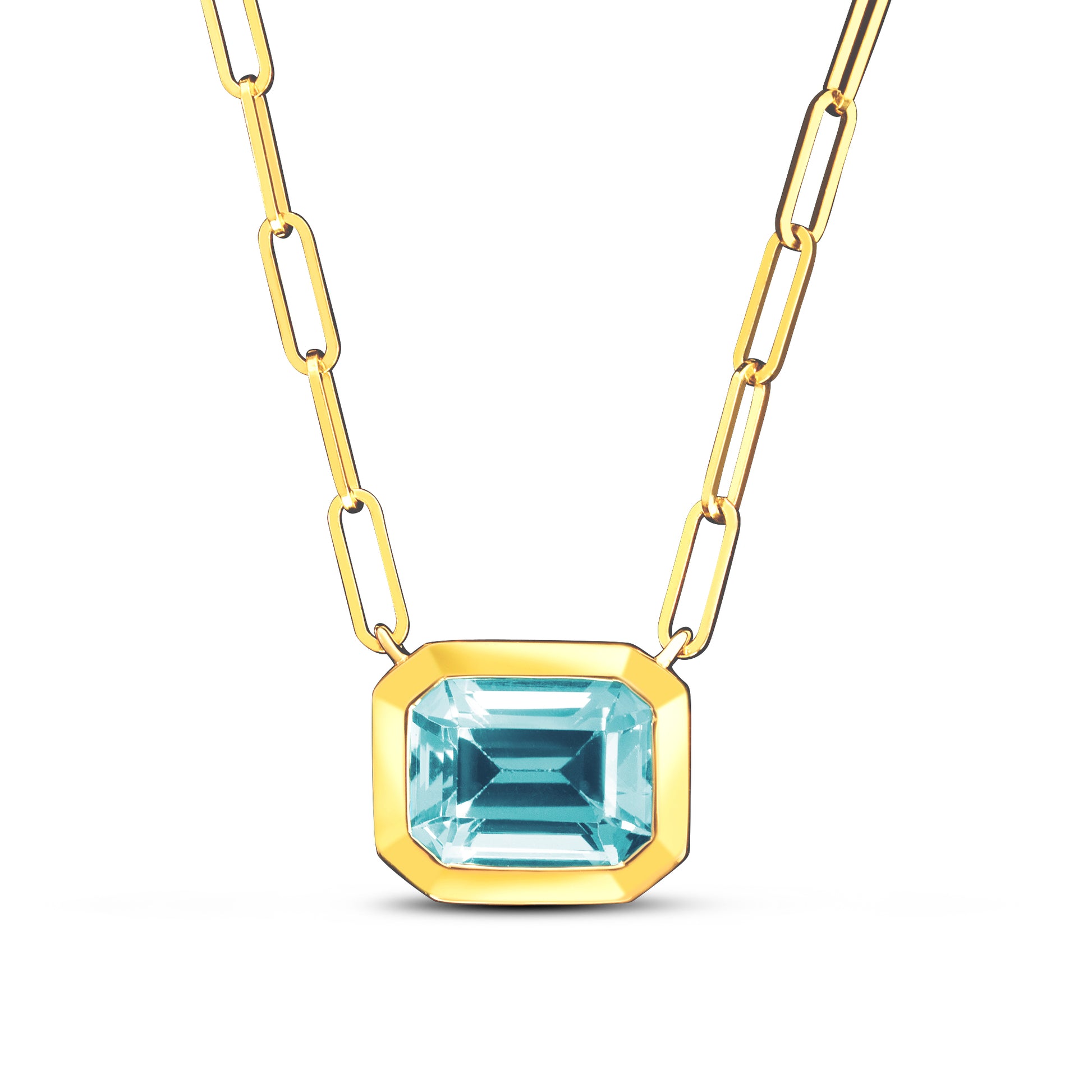 The emerald cut blue topaz 14k yellow gold paperclip necklace is a stunning piece of jewelry that is sure to catch the eye of anyone who sees it. The necklace features a beautiful 3 1/4 carat emerald cut blue topaz, elegant in style and elongated in shape. The chain measures 18 inches in length, which is a popular size for necklaces and will sit comfortably on most necks. Whether worn alone or paired with other pieces, this necklace is sure to become a cherished addition to any jewelry collection. Enjoy free 2 day shipping or in-store pickup.