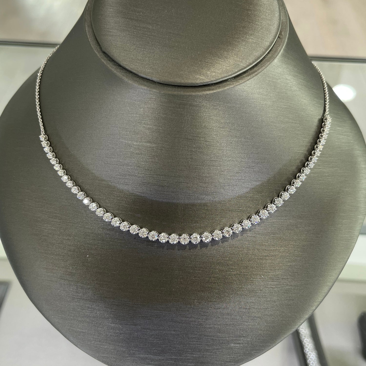 Shop this beautiful 3 carat total weight lab grown diamond tennis necklace in sterling silver with free two day shipping or in-store pickup at Robert Irwin Jewelers. Metal Type/Color: Sterling Silver Diamond Carat Total Weight: 3.00 Ctw Total Number of Diamonds: 47 Round Lab Grown Diamonds Chain Length: 18" Adjustable