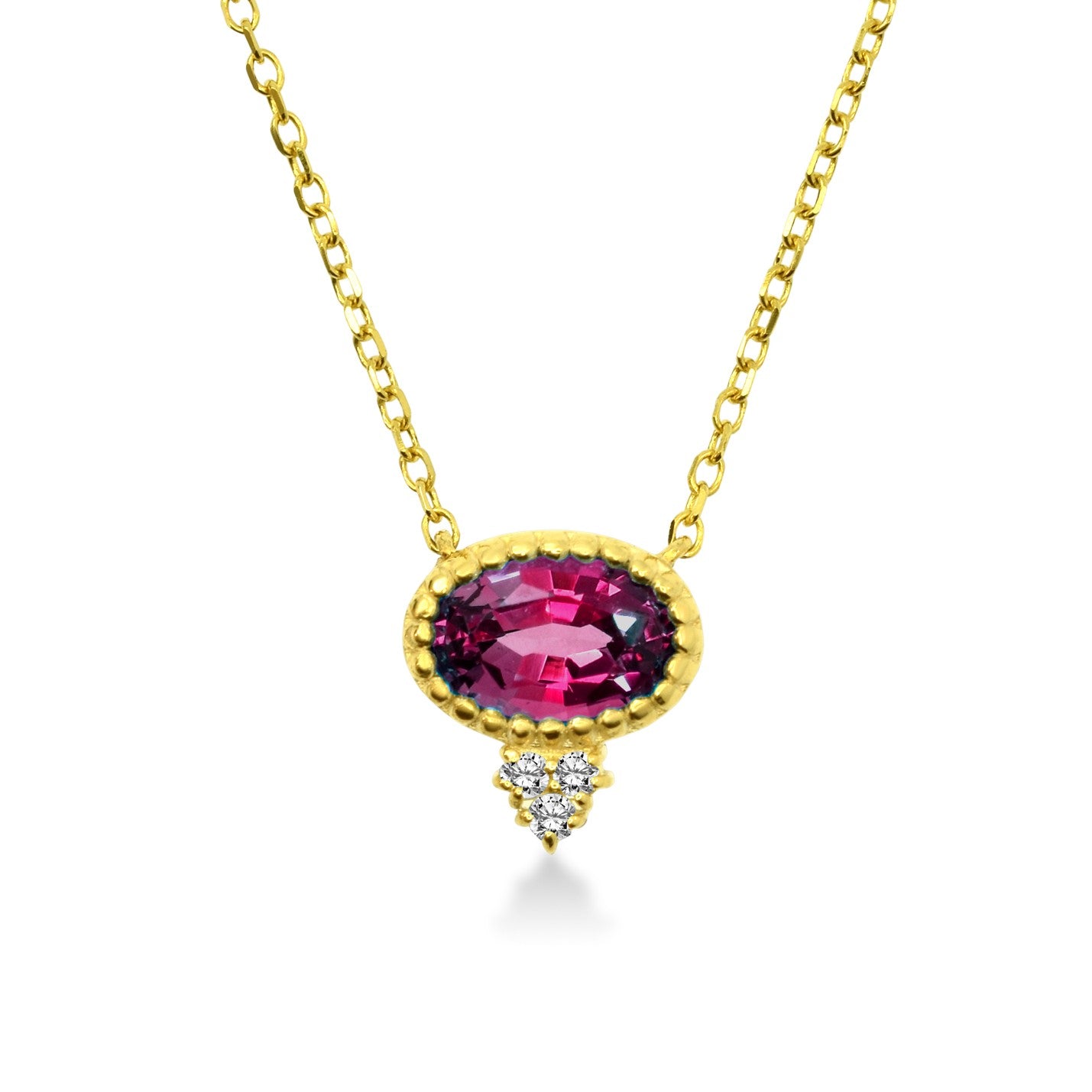 The oval rhodolite and diamond 14k yellow pendant is a stunning piece of jewelry that is sure to catch the eye of anyone who sees it. The necklace features a beautiful 0.60 carat oval rhodolite and 0.03ctw of round diamonds. The chain measures 18 inches in length, which is a popular size for necklaces and will sit comfortably on most necks. Whether worn alone or paired with other pieces, this necklace is sure to become a cherished addition to any jewelry collection. Enjoy free 2 day shipping or in-store pickup.