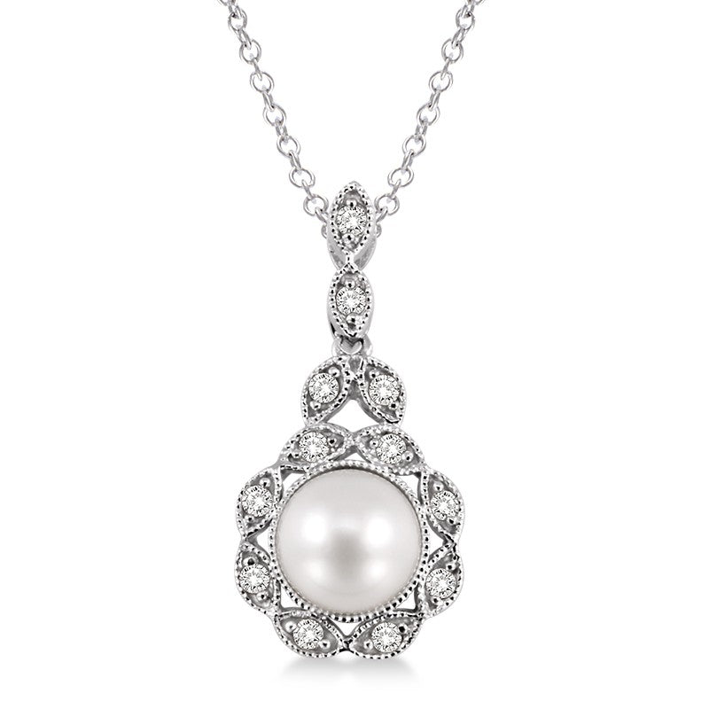 Metal Type/Color: Sterling Silver Total Carat Weight: 1/20ctw (1) 6.5mm x 6.5mm Cultured Pearl Total Diamonds: 12 Round Average Color: I Average Clarity: I1 18 Inch Chain Free Shipping or In-Store Pickup