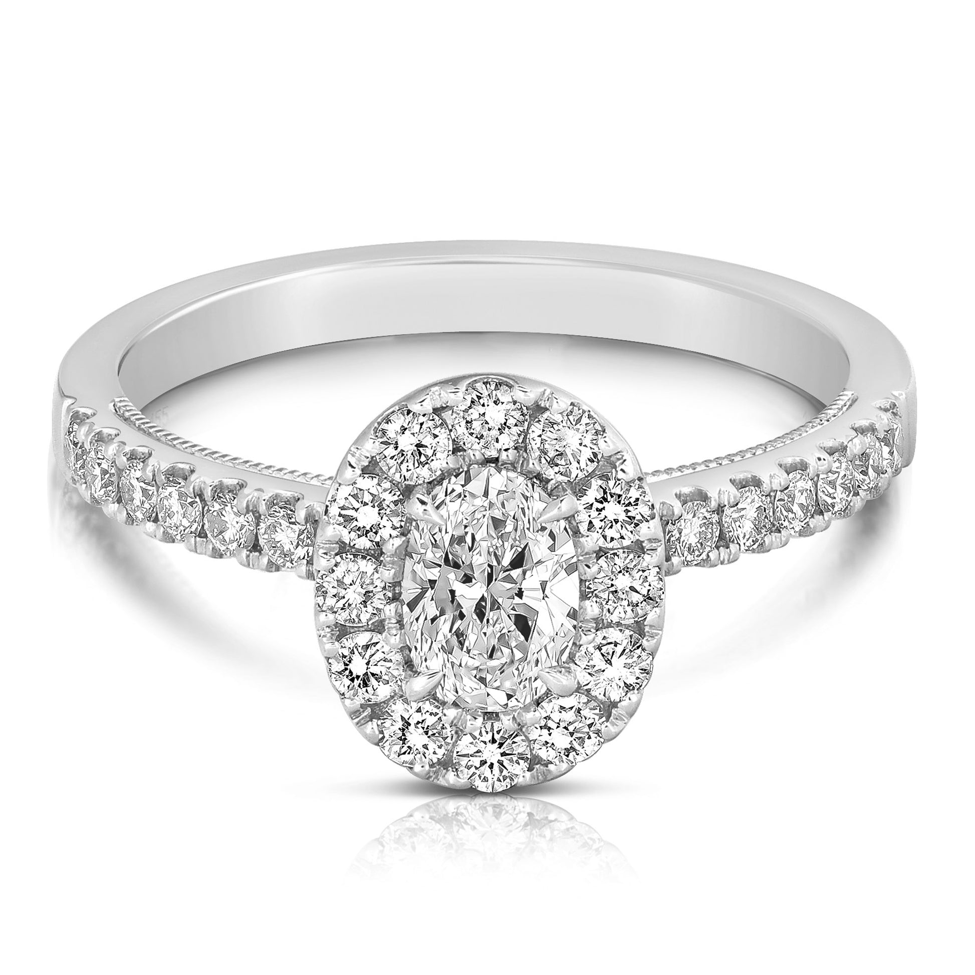 Shop this beautiful oval diamond halo engagement ring in 14 karat white gold with free two day shipping or in-store pickup.