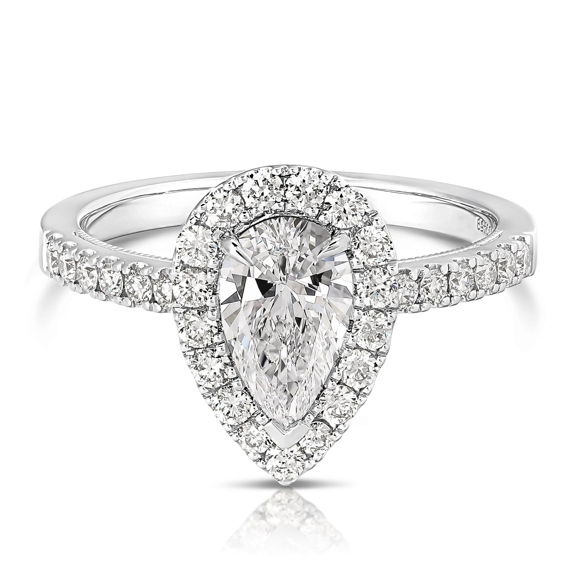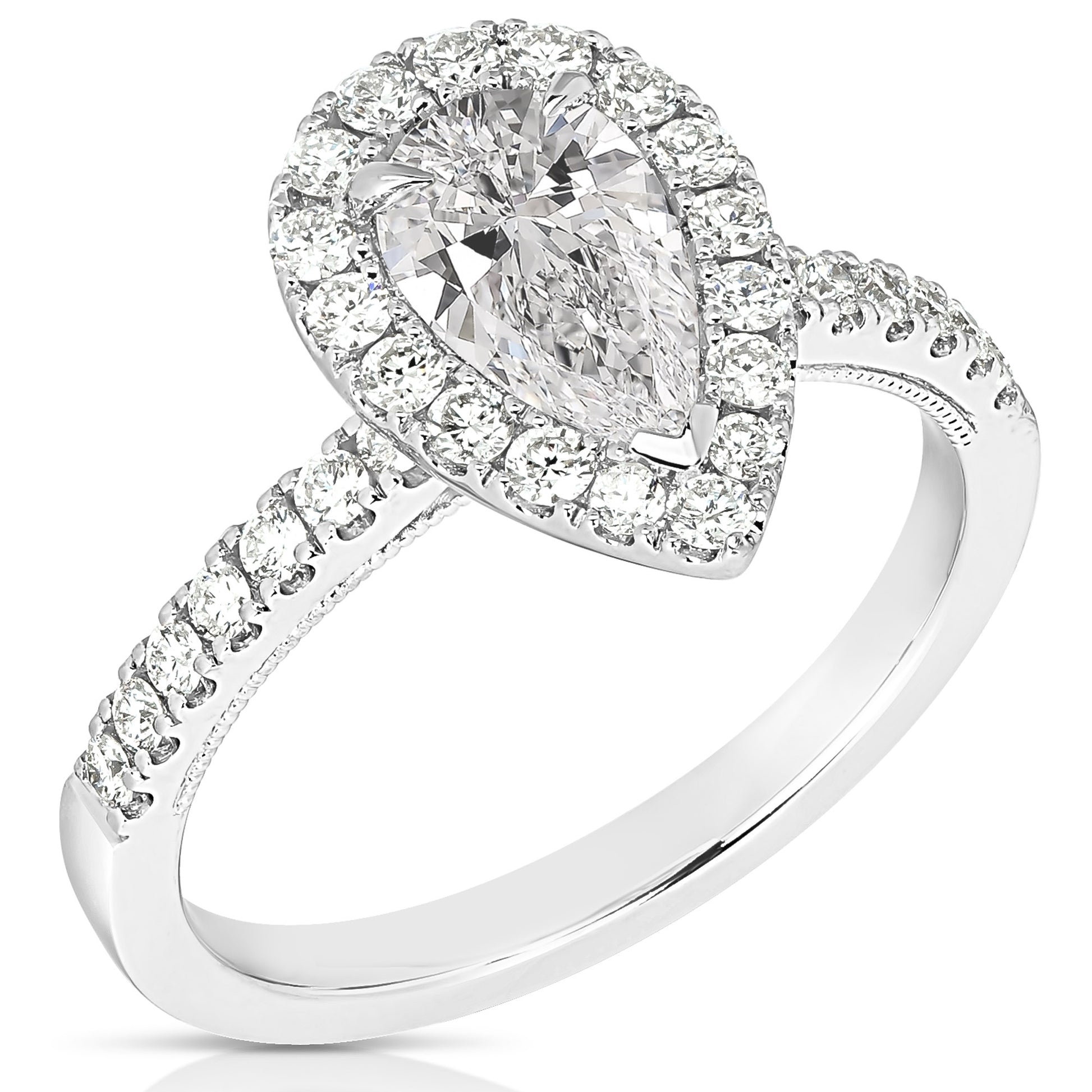 Capture her heart with this captivating engagement ring. Featuring brilliant lab-grown diamonds, prong-set at the center, surrounded by lab-grown diamonds in a pear halo. Totaling 1 1/2 ctw, this stunning ring is a breathtaking symbol of your love.