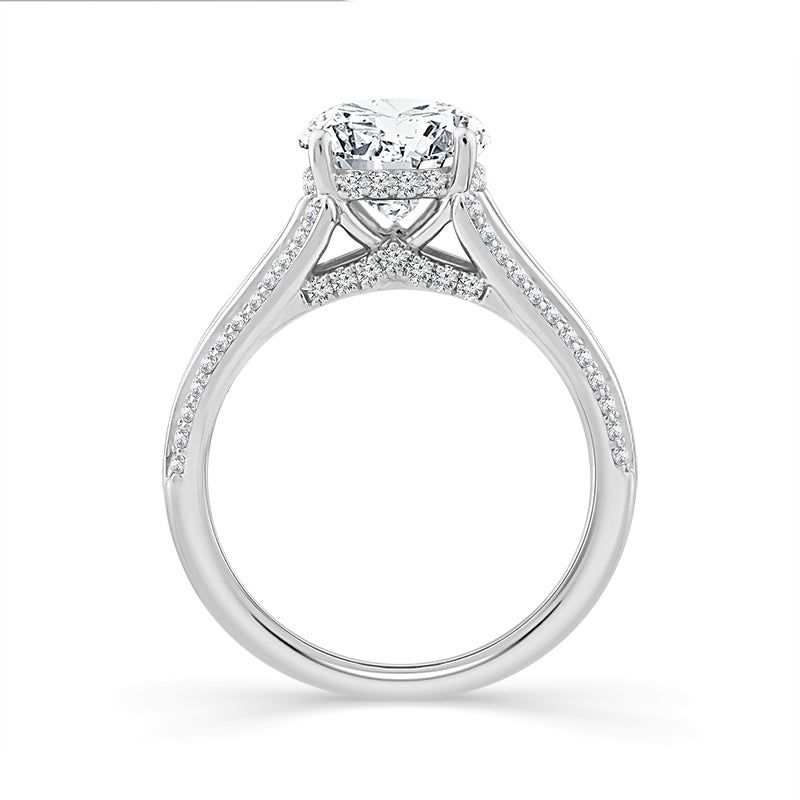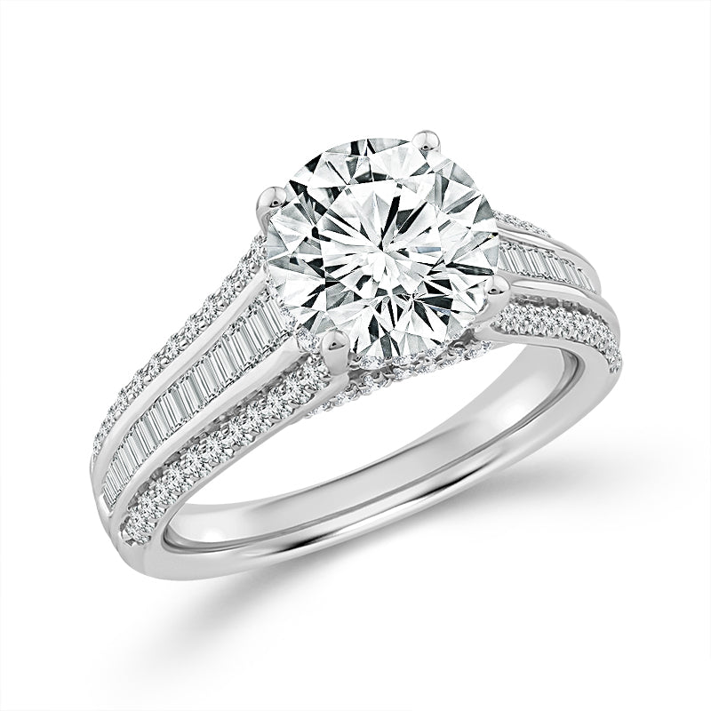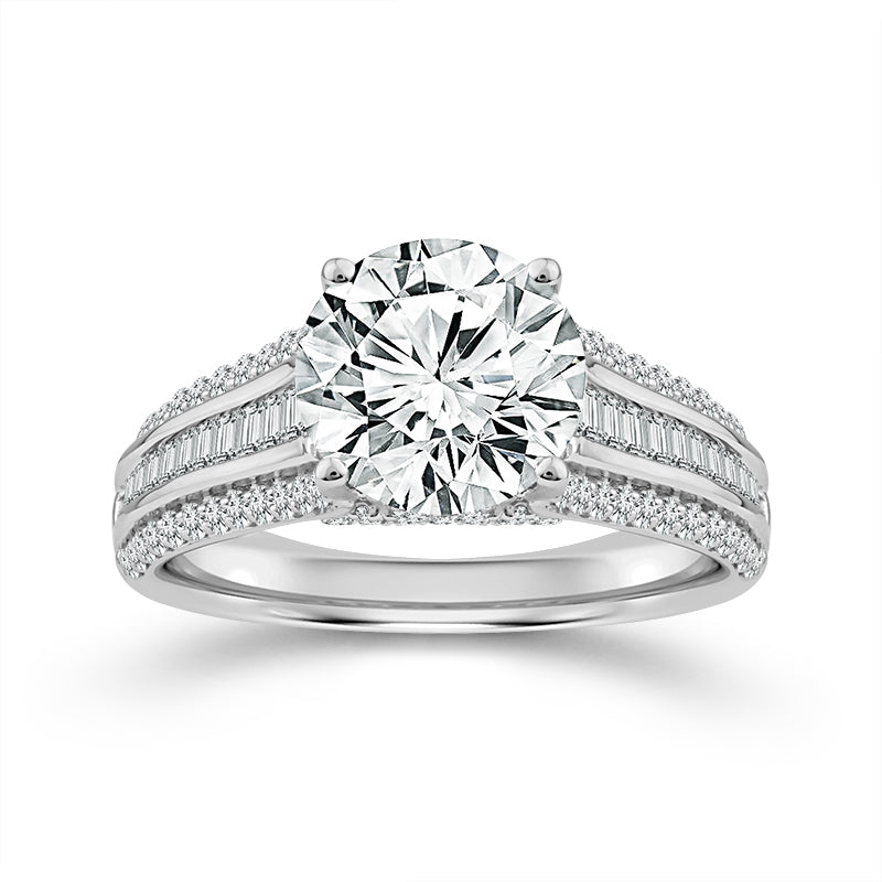 Metal: 14k White Gold Total Diamond Weight: 2 3/4 Ctw or Larger Center Diamond Carat Weight Range: 2 Ct Round Lab Grown Diamond or Larger # of Side Diamonds: 106 Round and Baguette Lab Grown Diamonds (3/4 Ctw) Guaranteed Diamond Color Range: E-F Color Guaranteed Diamond Clarity Range: VVS2-VS2 Cut: Excellent