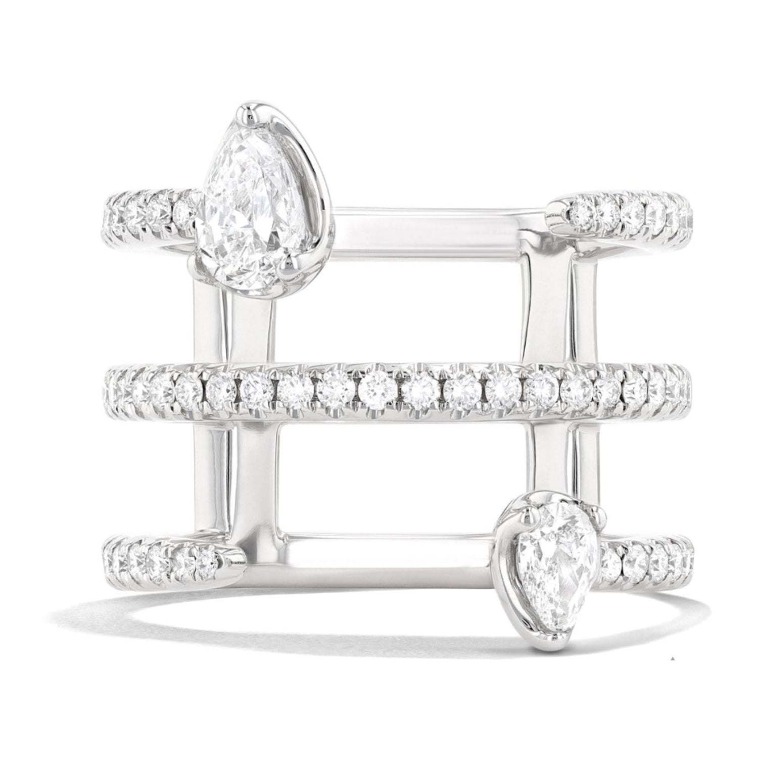 A bold statement of modern luxury, the Robert Irwin Couture Paradox 3-Row Floating Diamonds Ring is crafted in 18k white gold and features a striking open design. Two pear-shaped diamonds crown the ends of the band, while three rows of sparkling round brilliant diamonds create a floating effect across the ring.