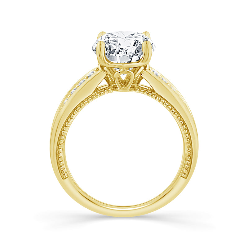 Metal: 14k Yellow Gold Total Diamond Weight: 3 Ctw or Larger Center Diamond Carat Weight Range: 3 Ct Round Lab Grown Diamond # of Side Diamonds: 40 Round Lab Grown Diamonds (5/8 Ctw) Guaranteed Diamond Color Range: E-F Color Guaranteed Diamond Clarity Range: VS1-VS2 Cut: Excellent