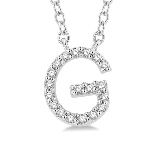 Initial pendants offer a personalized feel. Whether it is wearing one's own initials or the initials of a loved one, the initial pendant is a popular choice. It can be worn by itself or layered with other dainty pendants. So, if you have a 'G' initial in mind, this initial pendant would be a perfect buy. It is also decorated with round-cut diamonds to enhance its appeal. There are a total of 19 prong set round cut diamonds embellishing the initial pendant. A cat chain carries the pendant, both of which are styled in 10-karat white gold. The total diamond weight is 1/20 ctw. Free shipping or in-store pickup.