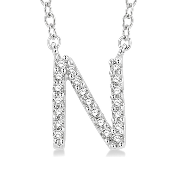 Initial pendants offer a personalized feel. Whether it is wearing one's own initials or the initials of a loved one, the initial pendant is a popular choice. It can be worn by itself or layered with other dainty pendants. So, if you have an 'N' initial in mind, this initial pendant would be a perfect buy. It is also decorated with round-cut diamonds to enhance its appeal. There are a total of 21 prong set round cut diamonds embellishing the initial pendant. A cat chain carries the pendant, both of which are styled in 10-karat white gold. The total diamond weight is 1/20 ctw. Free shipping or in-store pickup.