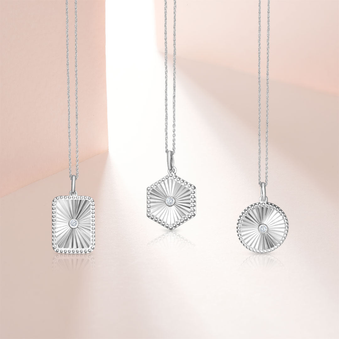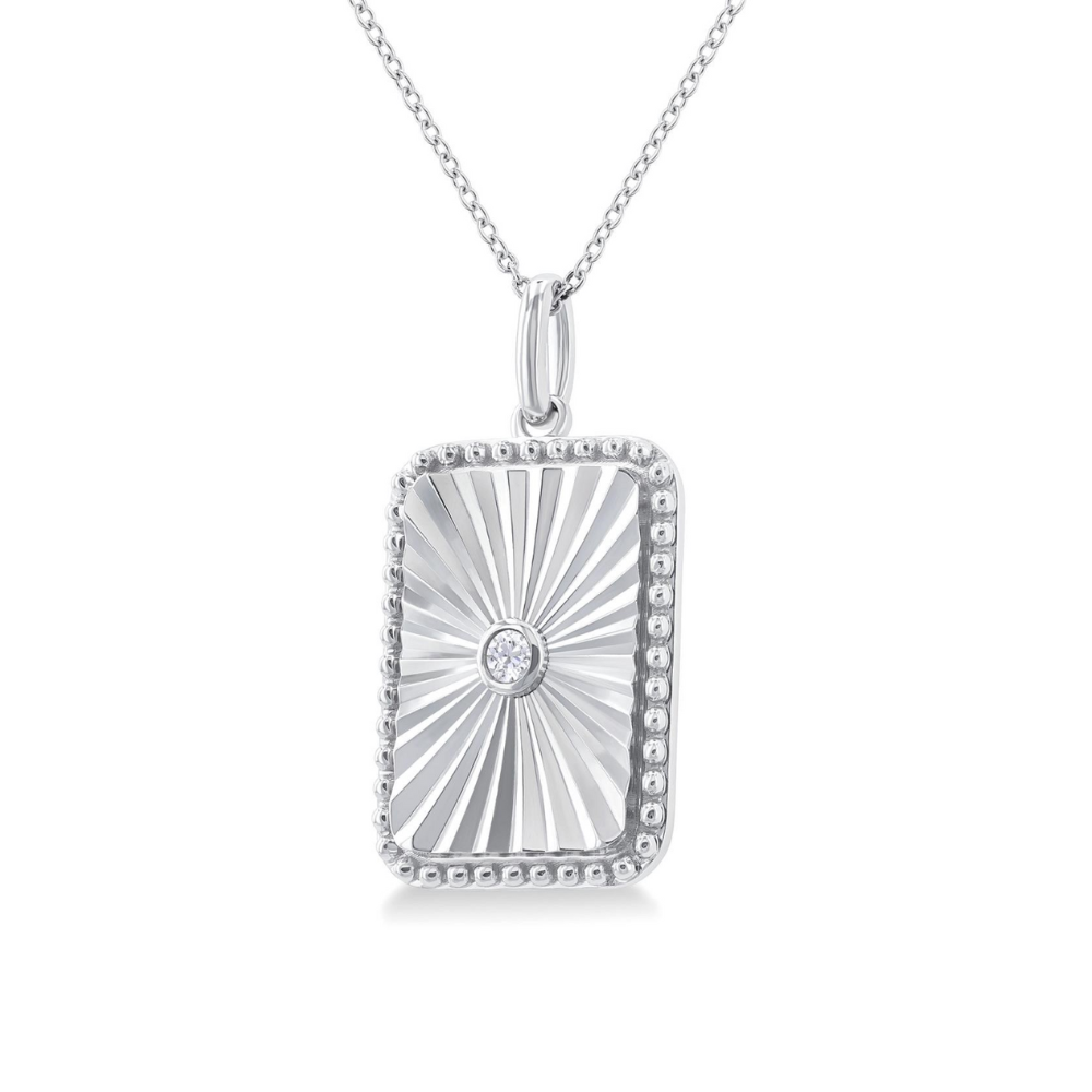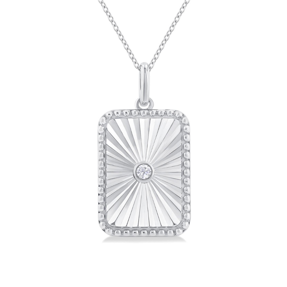 The rectangle is considered a sacred symbol in many cultures. It is worn for its symbolism, as it represents unity, balance, equality, harmony, truth and love. This diamond rectangle pendant offers appeal, and can be gifted to loved ones. It features a rectangle medallion, with a textured center and beaded border. Also, a bezel set round cut diamond nestles in the center of the medallion. The rectangle medallion pendant is held on a 1.00MM SSL cable chain, both of which are styled in sterling silver. Total diamond weight is 1/20 ctw. Enjoy free two day shipping or in-store pickup.