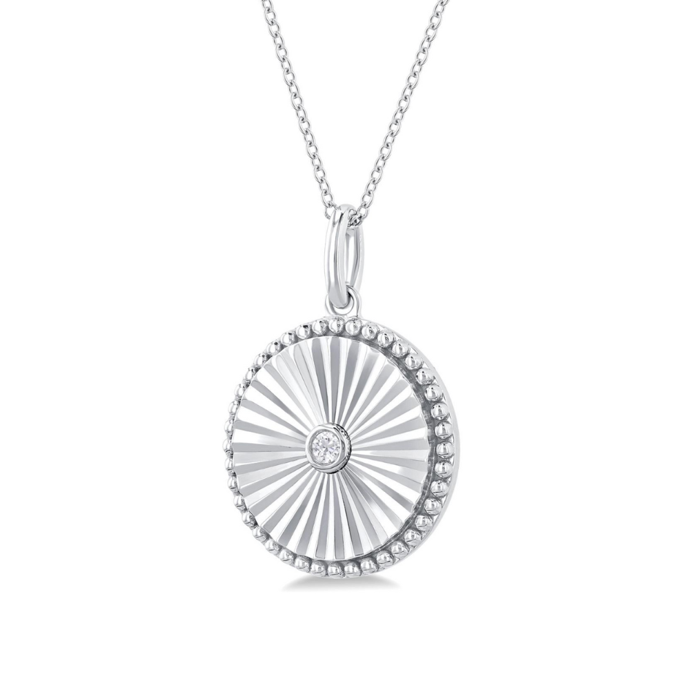 The round is considered a sacred symbol in many cultures. It is worn for its symbolism, as it represents unity, balance, equality, harmony, truth and love. This diamond round pendant offers appeal, and can be gifted to loved ones. It features a round medallion, with a textured center and beaded border. Also, a bezel set round cut diamond nestles in the center of the medallion. The round medallion pendant is held on a 1.00MM SSL cable chain, both of which are styled in sterling silver. Total diamond weight is 1/20 ctw. Enjoy free two day shipping or in-store pickup.