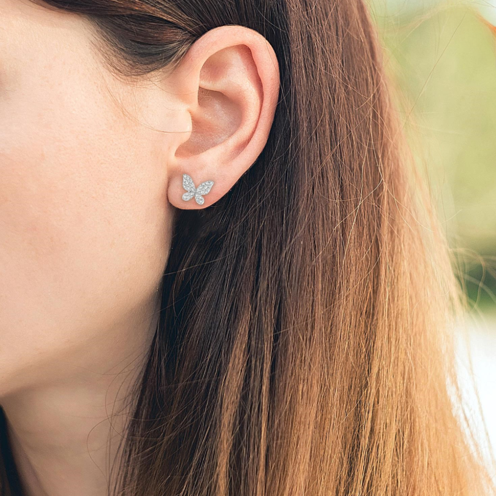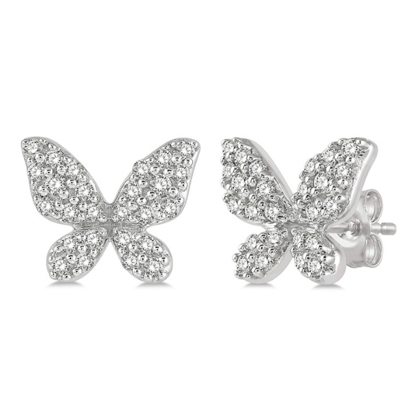 You are considered fashionable if you follow the latest trends, which means this diamond butterfly earring from the new and trending Petite collection would make a wise choice. A butterfly symbolizes an important life change, a rebirth. Besides, the earring is attractive and stylish. It features a butterfly motif, forming the body of the studs, with an ear nut closure securing it. There are a total of 52 prong hand set round cut diamonds embellishing the earring, 8 on the lower wings and 18 diamonds on the larger upper wings on each earring. The stud earring is carved in a rhodium finish 10 karat white gold. Total diamond weight is 1/5 ctw. Free shipping or in-store pickup.
