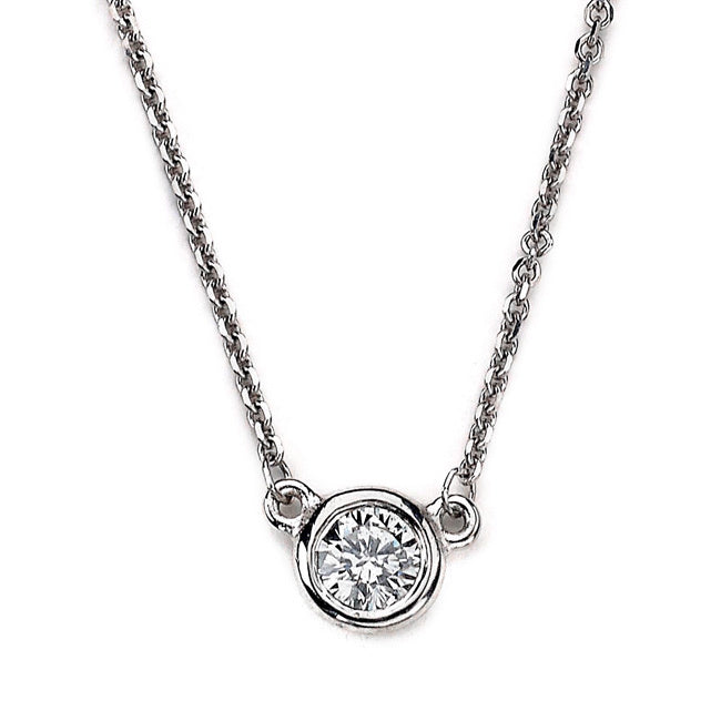 This beautiful 14K white gold necklace features a 1/4 carat round brilliant cut diamond, graded G color and SI1 clarity, in a modern bezel setting that highlights the diamond's natural beauty. The near-colorless diamond is securely set, allowing it to sparkle effortlessly against the warm glow of the yellow gold. The classic yet minimalist design makes this necklace a versatile choice, perfect for both casual wear and formal occasions. Whether worn alone or layered with other pieces, this diamond solitaire necklace is an elegant addition to any jewelry collection and a timeless symbol of sophistication.