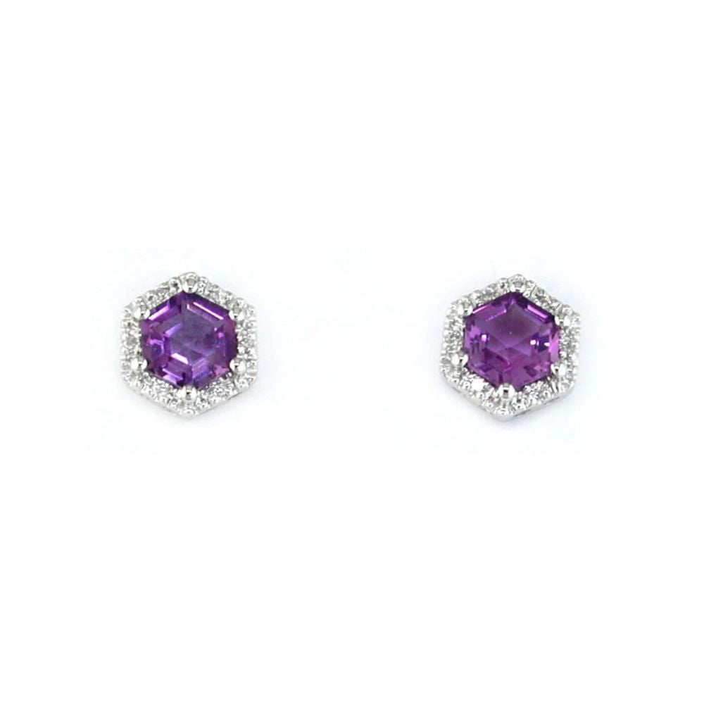 Shop these amethyst and diamond halo earrings in 14 karat white gold with free two day shipping or in-store pickup.