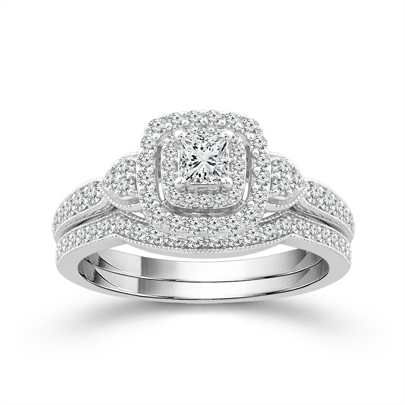 10 Karat White Gold 3/4 Carat Princess Cut Diamond Halo Wedding Set Metal Type/Color: 10 Karat White Gold Total Diamond Carat Weight: 3/4 Carat Center Diamond Shape and Carat Weight: 1/4 Carat Princess Cut Total Number of Side Diamonds: 81 Round Diamonds | 1/2 Carat Total Weight Free Shipping or In-Store Pickup