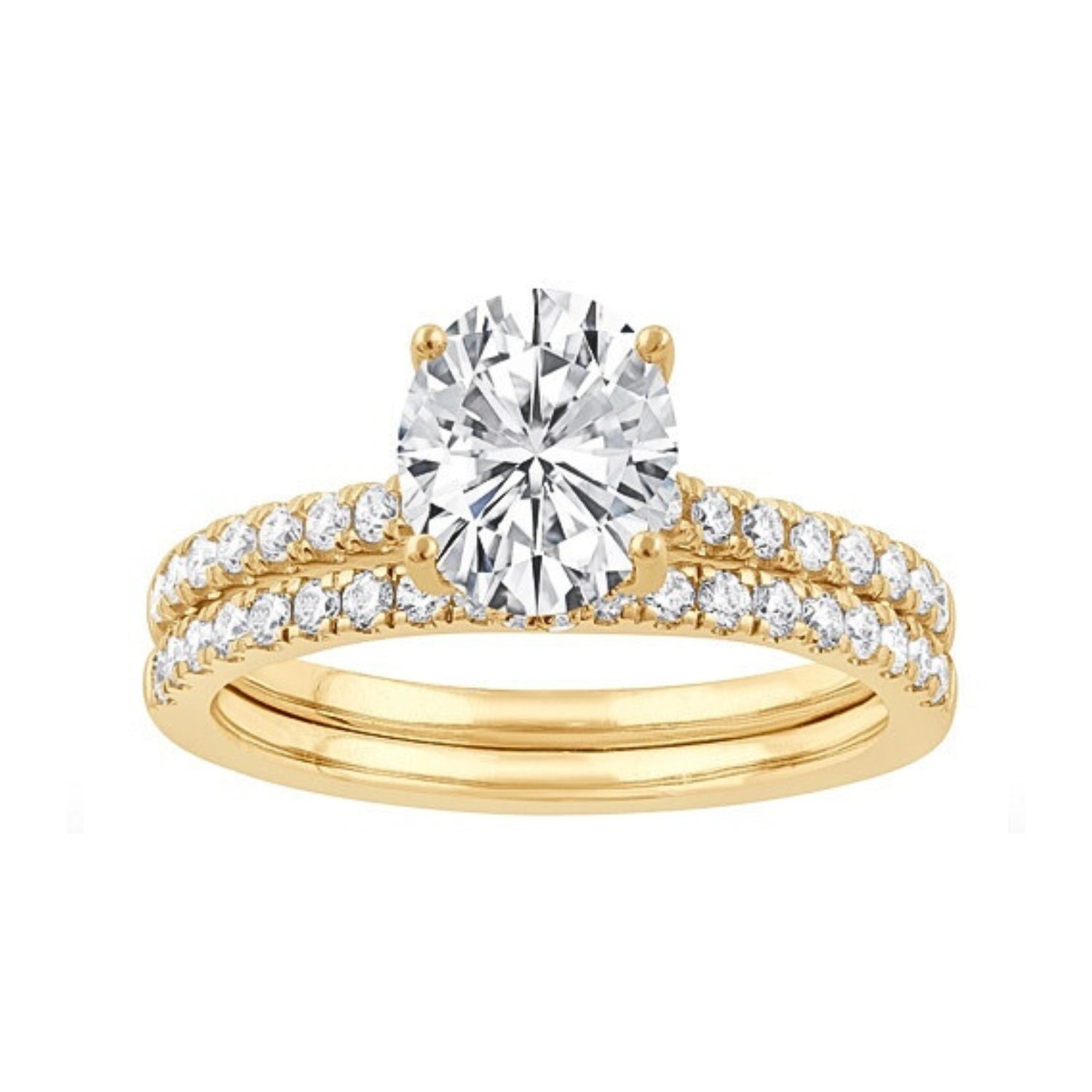 Shop this stunning oval hidden halo lab grown diamond wedding set in 14 karat yellow gold with free two day shipping or in-store pickup. Enjoy free ring sizing for life with your purchase.