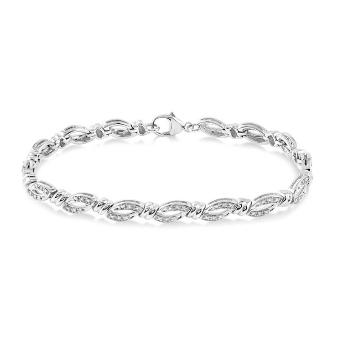 Tie your relationship into a knot of love with this Knot shape diamond bracelet. Fashioned on luminous sterling silver, this bracelet is adorned with 30 shimmering single cut diamonds, set in a beautifully complementary knot shape motif. The diamonds are perfectly pave set. Total diamond weight is 1/6 ctw. Fastens with a secure clasp. Enjoy free two day shipping or in-store pickup.