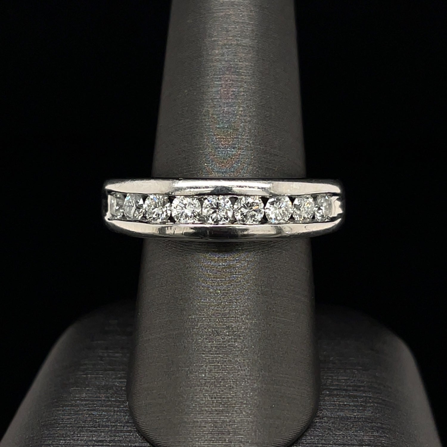 Shop this stunning 1 carat total weight channel set mens diamond wedding band in 10 karat white gold with free two day shipping or in-store pickup at Robert Irwin Jewelers. Metal Type/Color: 10k White Gold Diamond Carat Total Weight: 1.00 Ctw Total # of Diamonds: 9 Round Diamonds. Diamond Color: H-I Color Diamond Clarity: I1 Clarity