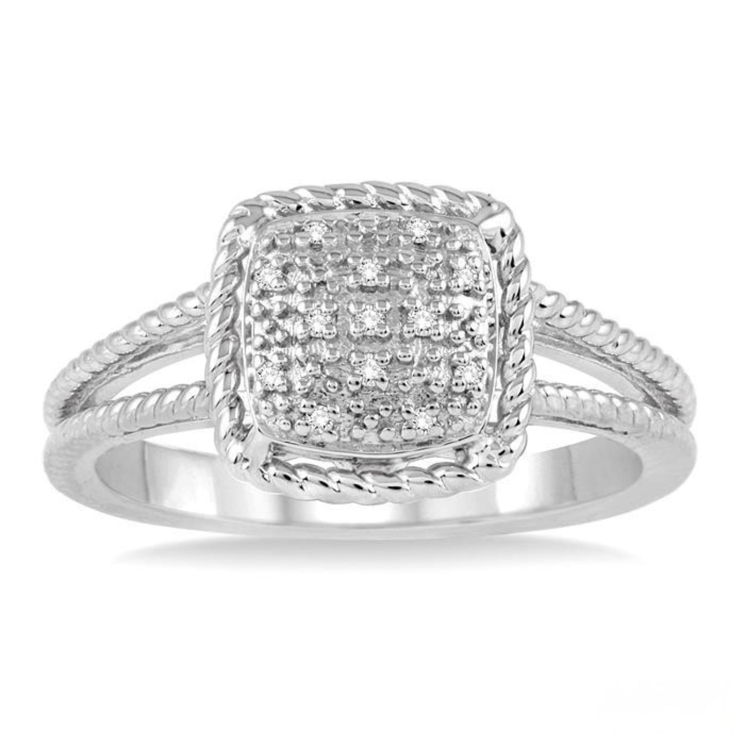 Luminescent and glamorous, this elegant diamond ring is fashioned in luminous sterling silver. This square shaped ring features a cluster of 13 prong set shimmering single cut diamonds at its center engrossed by a bright finish rope design on the border and split shank. The total diamond weight is 1/20 Ctw.
