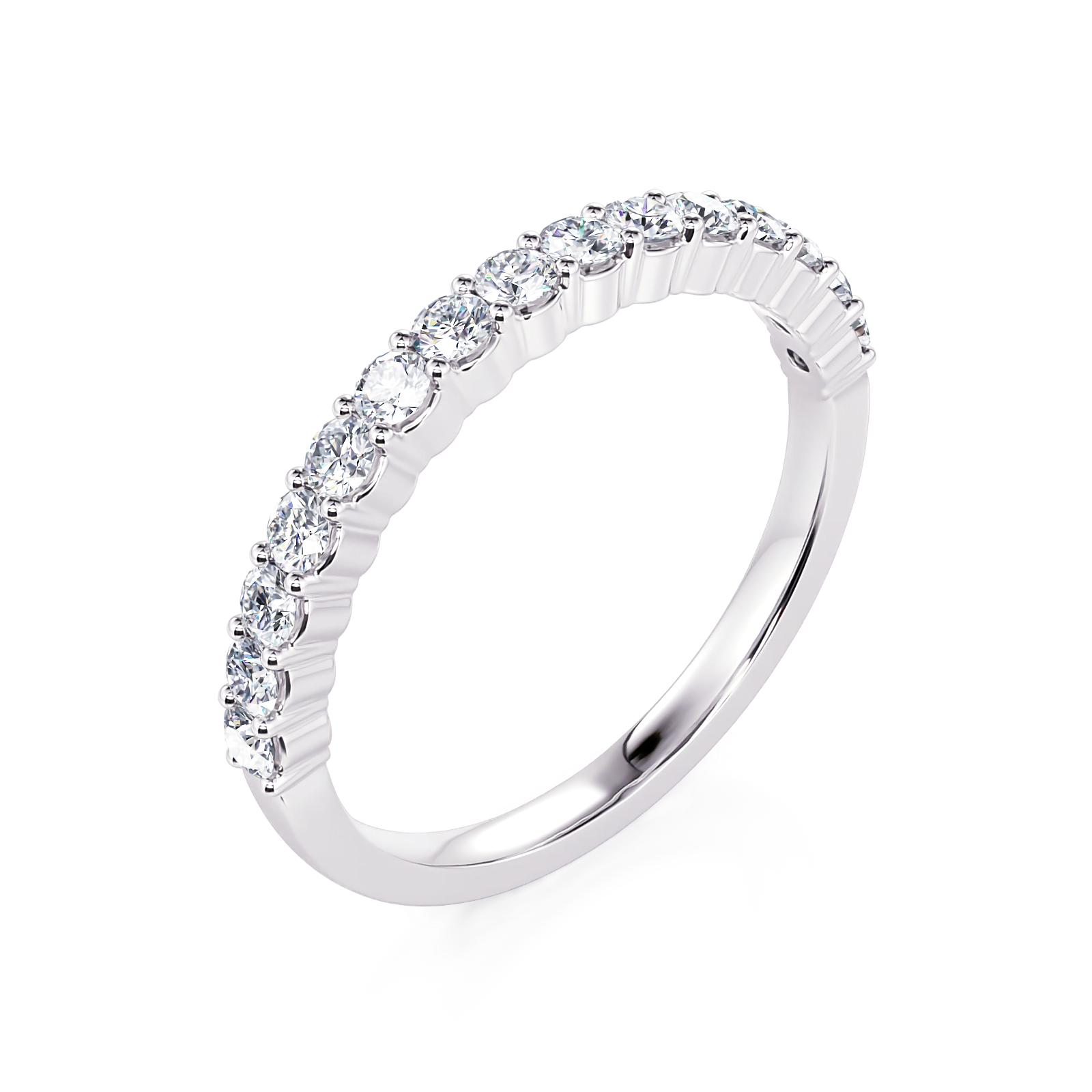 This beautiful classic shared prong diamond wedding band features 1/3 ctw of round diamonds going halfway down the shank.