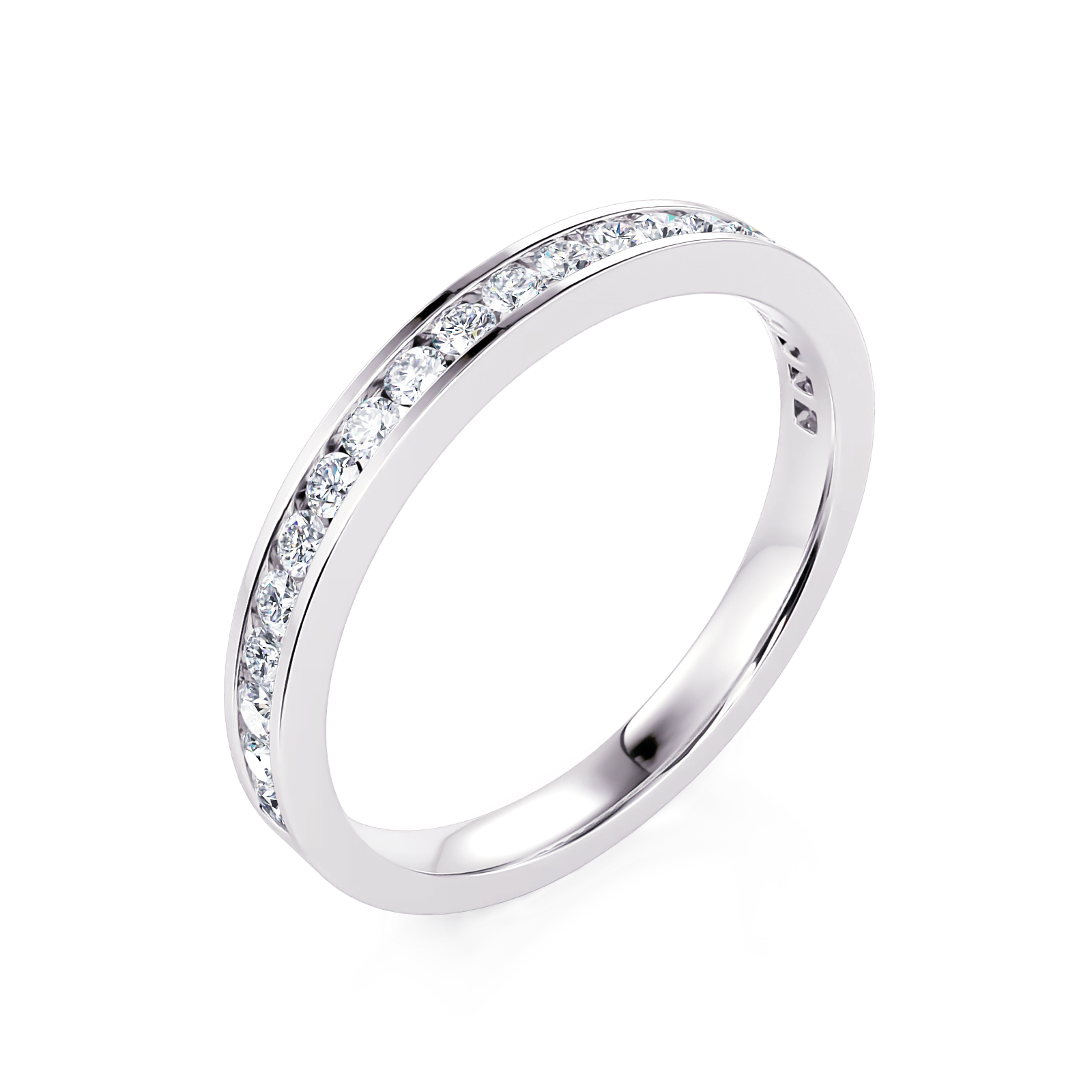This beautiful classic channel set diamond wedding band features 1/4 ctw of round diamonds going halfway down the shank.