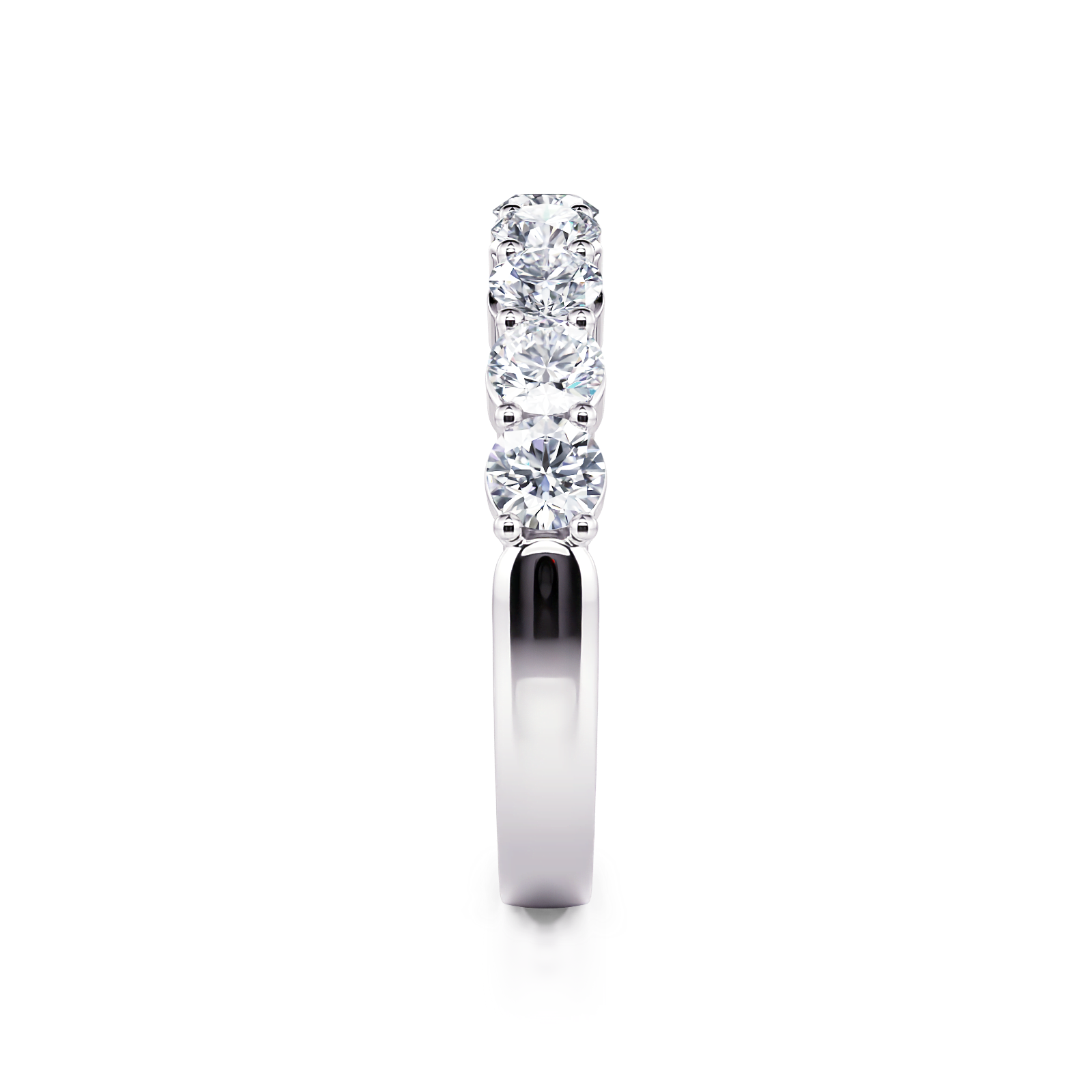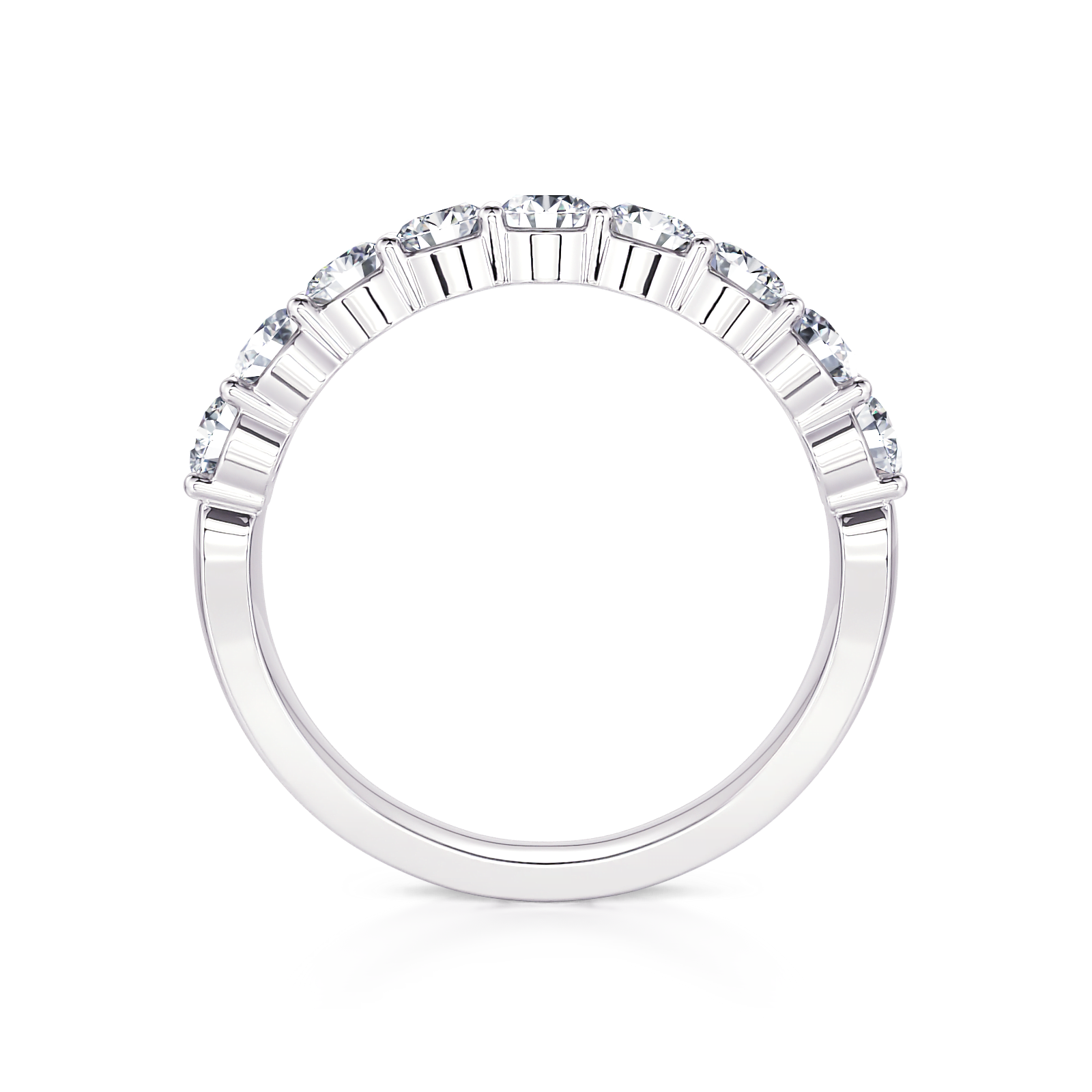 This beautiful classic shared prong diamond wedding band features 3/4 ctw of round diamonds going halfway down the shank.