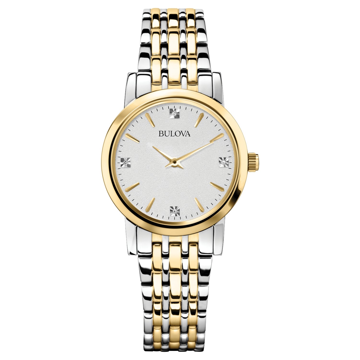 From the Classic Collection. In stainless steel with two-tone finish, 4 diamonds individually hand-set on silver-white patterned dial, and locking fold-over clasp.