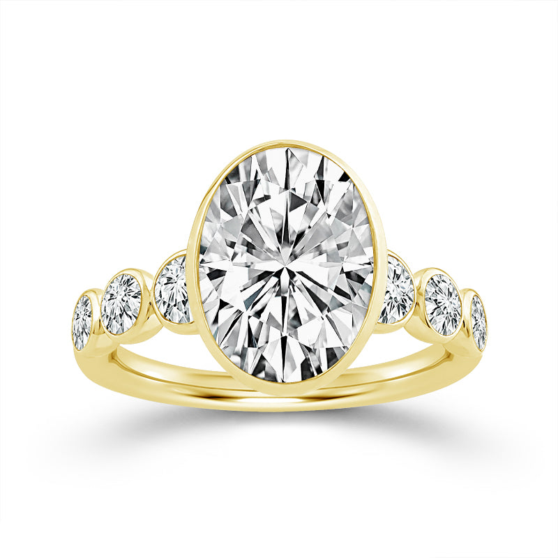 Metal: 14k Yellow Gold Total Diamond Weight: 3 3/4 Ctw Center Diamond Carat Weight Range: 3 Carat or Larger Oval Lab Grown Diamond # of Side Diamonds: 16 Lab Grown Diamonds Guaranteed Diamond Color Range: D-F Color Guaranteed Diamond Clarity Range: VVS-VS Cut: Excellent