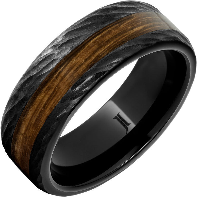 From the Barrel Aged Collection, this Black Diamond Ceramic ring features a 3mm oak bourbon barrel off center inlay and a bark finish for texture and a rugged look.