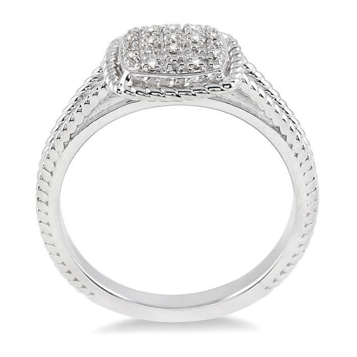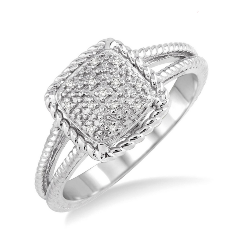 Luminescent and glamorous, this elegant diamond ring is fashioned in luminous sterling silver. This square shaped ring features a cluster of 13 prong set shimmering single cut diamonds at its center engrossed by a bright finish rope design on the border and split shank. The total diamond weight is 1/20 Ctw.